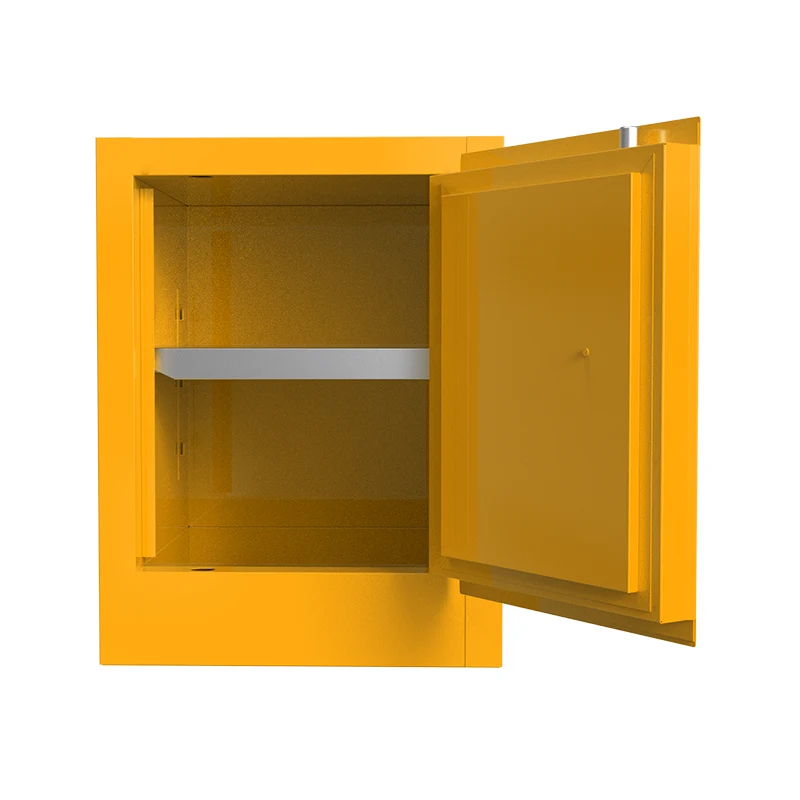نام محصول: کابینت قابل اشتعال مدل محصول: GS004 ابعاد خارجی: H560×W430×D430mm ابعاد داخلی: H460×W350×D330mm ابعاد قفسه: W348×D330×H25mm حجم: 4/15 (گالن/لیتر) وزن: 25 کیلوگرم روش باز کردن درب: دستی/خودکار قفسه ها: یک قفسه قابل تنظیم نوع درب: تک درب دستگاه قفل: دو قفل رنگ: زرد (اسپری رزین اپوکسی - رنگ شده) نکات: با توجه به بطری های معرف 500 میلی لیتری، 2 قفسه را می توان با 9 بطری در هر قفسه قرار داد. |