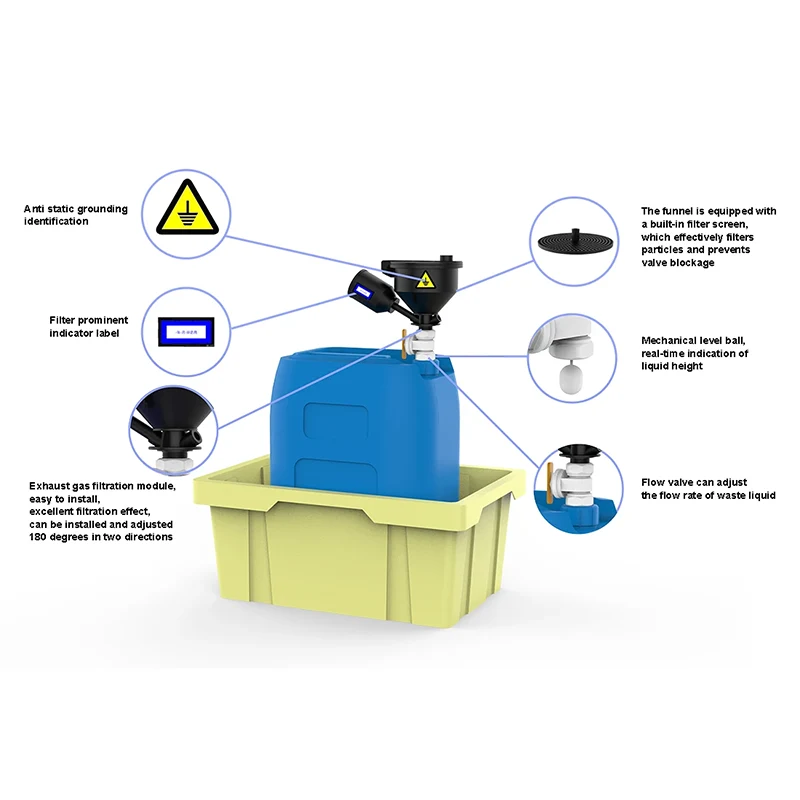 دستگاه جمع آوری مایعات زباله دارای ویژگی های قابل توجهی است. ظرف جمع آوری آن از مواد اولیه PP ضد الکتریسیته ساکن وارداتی ساخته شده است که نه تنها پایداری مواد را تضمین می کند بلکه عملکرد عامل ضد الکتریسیته ساکن را نیز به طور موثر اعمال می کند و الکتریسیته ساکن قیف مایع زباله را در محدوده 10^5 تا 10^9 کنترل می کند و خطر بلایای ناشی از الکتریسیته ساکن را تا حد زیادی کاهش می دهد. قیف دارای طراحی پیچیده ای است. پوشش بالایی ضد نشتی با یک پوشش آب بندی و یک قیف فیلتر ضد پاشش جفت می شود و می توان در صورت نیاز یک شیر برای اطمینان از ایمنی ذخیره سازی مایعات زباله نصب کرد. پوشش بالایی از نوع وزنه تعادل به طور خودکار انتشار گازهای خروجی را با توجه به شرایط فشار داخلی باز شدن در 100Pa و بسته شدن در 50Pa تنظیم می کند و از انفجار و احتراق خود به خود جلوگیری می کند. فیلتر گاز اگزوز به صورت مارپیچ متصل می شود که برای تعویض راحت است و از تبخیر اجزای شیمیایی جلوگیری می کند. 5 نوع مختلف برای انطباق دقیق با درمان های مختلف گازهای خروجی موجود است.